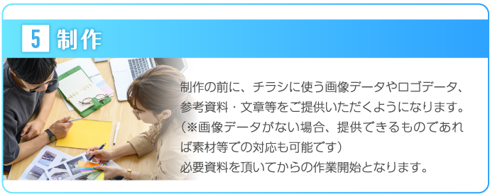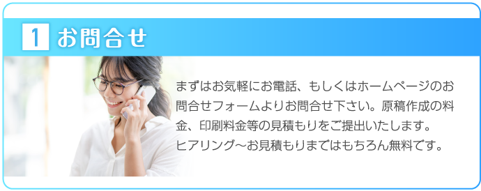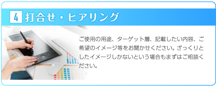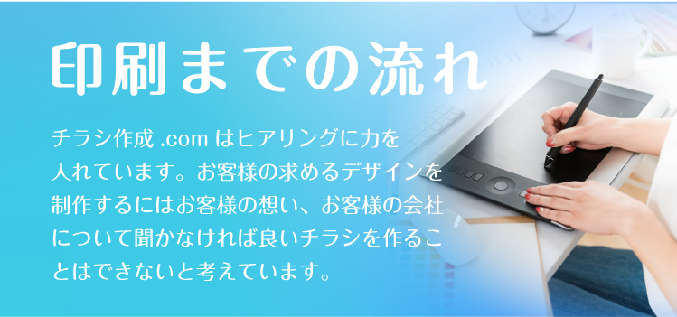 熊本チラシ作成.comでは、お客様の思いを形にするため、ヒアリングに力をいれております。何を伝えていいかわからないという方も多いかと思いますが、好きな色、思い、こんなことをしたいなど、ざっくりとしたイメージで構いませんので、担当スタッフにお伝えください。それを形にするのがプロの私たちの仕事ですので、安心してお任せしていただければと思います。