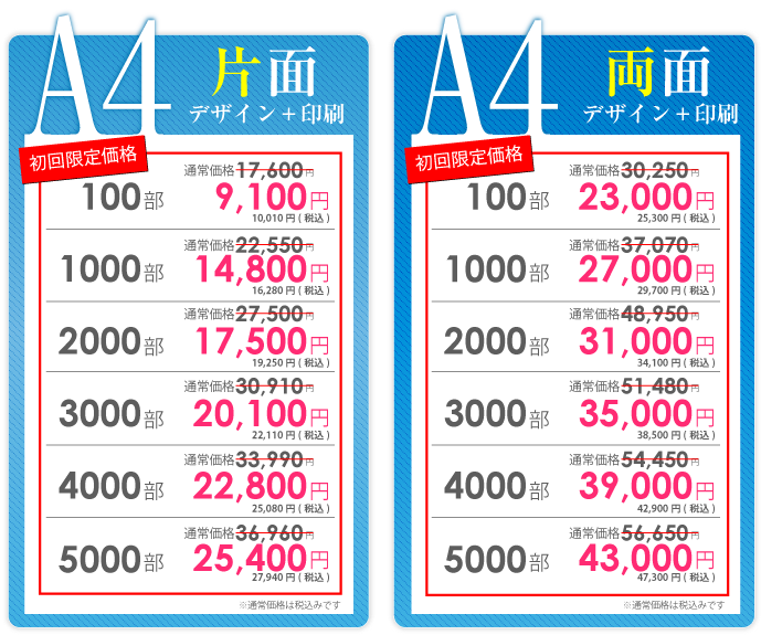 チラシデザイン作成、制作の強み 弊社の一番の強みは、低価格でハイクオリティーなチラシデザインの作成です。一般的な地元熊本のデザイン会社ですと、チラシデザイン代片面で3万~4万が相場だと思います。 確かに安い業者はあるのですが、クオリティー的にプロとは言えないレベルのデザインの作成をし、一万円以下で販売もしている業者もいますが、対応のスピードや作品の質に疑問を感じます。熊本チラシ作成.comではデザイナー全員が数年間の実務経験を経験しているデザイナーを多数抱えている為、低価格でのデザイン制作が可能になりました。 制作依頼前にラフデザインをご依頼者様に提出する為、お客様のイメージにより近いチラシのデザインを作成しております。よくお会いしてチラシデザインの打ち合わせをしたいというお客様もいらっしゃいますが、弊社は低価格での提供を考えておりますのでやり取りは、電話やメール、FAXなどで対応しております。また、 修正などもお客様がご納得していただくまで、何度でもチラシデザインの修正を承っております。 続いて、チラシデザインの制作スピードに関しましても、最短で当日・翌日仕上げの特急便、2~3日で完成するお急ぎ便の2種類をご用意しております。 チラシデザインの特急便はA4サイズの場合、片面34000円~でお受けしております。チラシデザインのお急ぎ便は片面25500円~でお受けしております。お急ぎの場合は、是非弊社の担当者までお気軽にお問合せいただければ幸いです。 スピードを求めないのでしたら、弊社で1番のお勧めはチラシ印刷パックをオススメしております。一番安いプランですと、チラシデザイン+印刷でA6サイズ100枚で税抜5980円からオススメしております。A4サイズでの最安パックは、チラシデザイン+印刷+送料込みで100枚で9,100円でお受けしております。 また他に何かわからないことがございましたらなんなりとお気軽にお問合せください。