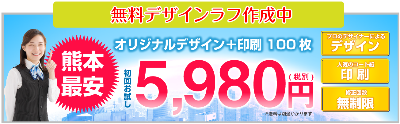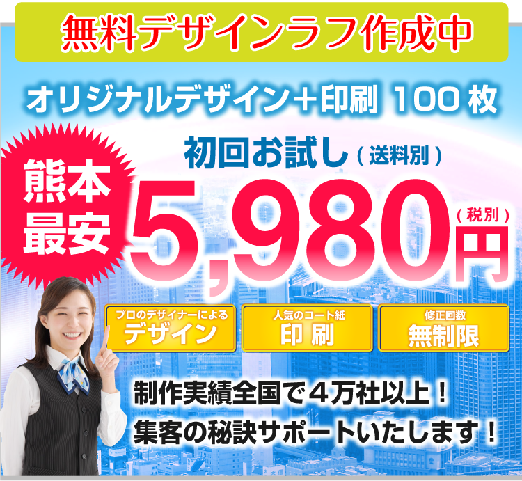 チラシデザイン+印刷で、税抜5980円熊本県下最安値に挑戦!!チラシお急ぎ納期OK最短納期当日仕上げ対応中!! 熊本県下同業他社より1円でも高い場合はご相談ください!!誠心誠意対応させて頂きます。チラシのことなら熊本チラシ作成.com!